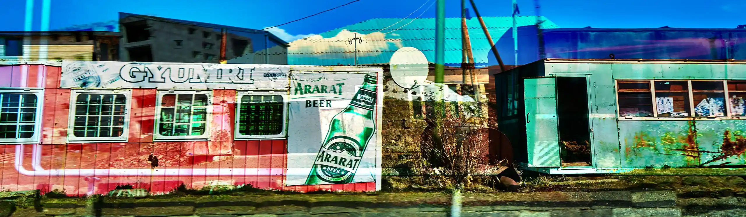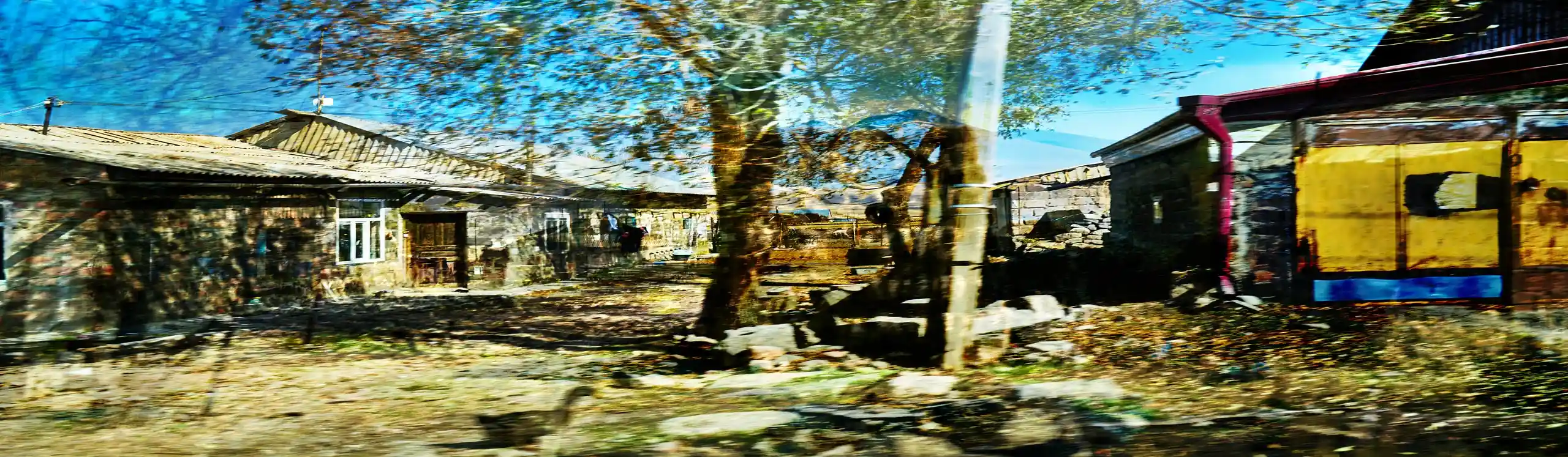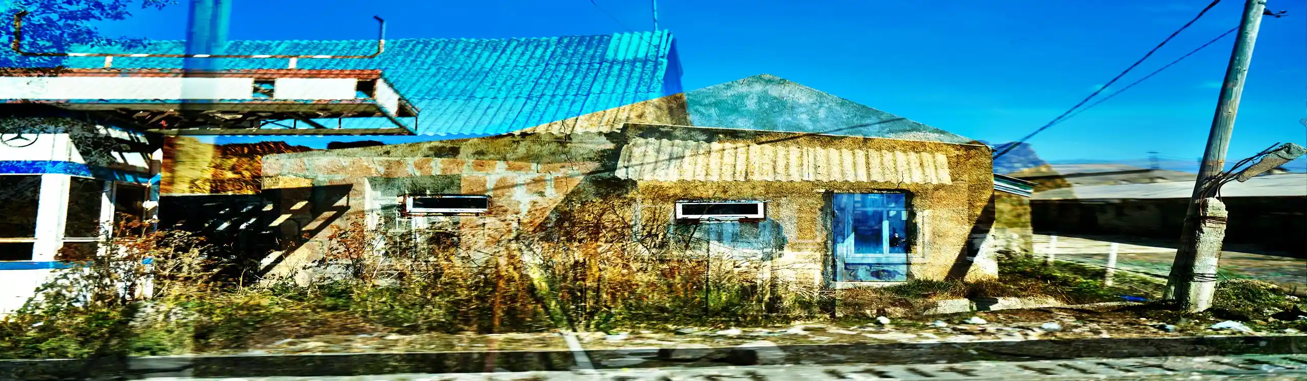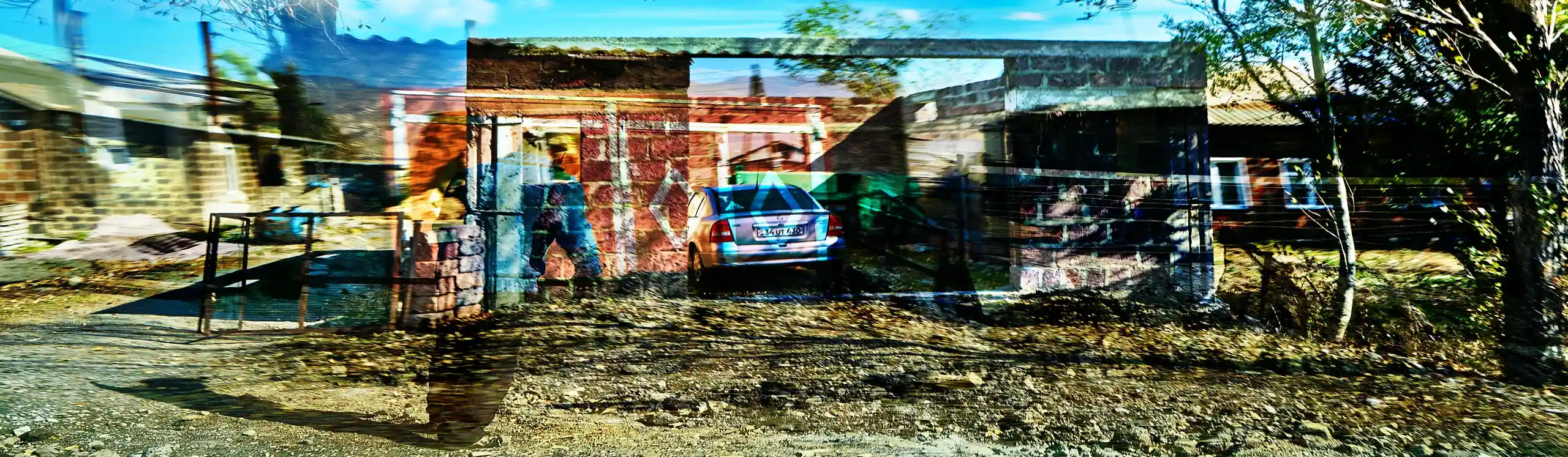 KARI-K’AMI – das sind die georgischen und armenischen Wörter für Fahrtwind. Dieser Fahrtwind durchzieht das Area Composing als Leitmotiv im Sound und in den Bildern. Peter Hölscher nimmt die Fotografien auf seiner Reise von Georgien nach Armenien aus einem fahrenden Auto heraus auf. Was die Kamera in diesen unwiederbringlichen Augenblicken der Reise einfängt, kann er nur bedingt kontrollieren. Erst nach seiner Rückkehr offenbart sich der Schatz – ein spannungsvoller Moment. Bei der Bildentwicklung kristallisiert er intensive Farben und erstaunlich konkrete Motive heraus. Seine Bildkomposition zeigt die bizarren Eingriffe des Menschen in die archaische Landschaft des Kaukasus und die Zerstörung durch Erdbeben und Krieg: Trümmerfelder, aus denen neues Leben erwächst.